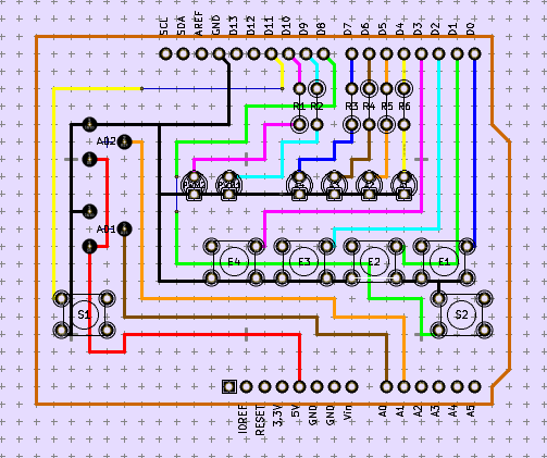 Weil Arduino von seinen Shields lebt, habe ich nicht lange überlegt und mit dem DIY Layout Creator ein Shield für die Bedienung und Anzeige erstellt. Ich konnte alles relativ kompakt halten und bekam es auf ein einziges Prototype Shield. Die komplette Datei habe ich natürlich auf Github hochgeladen.